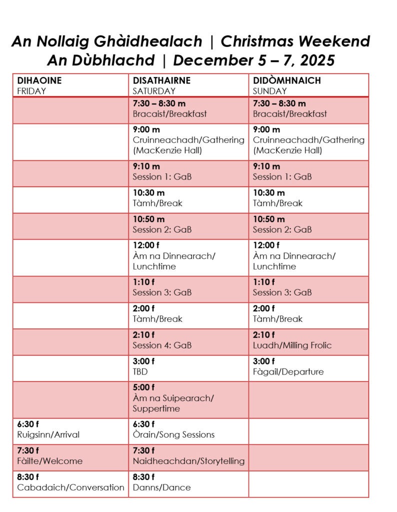 Join us for our Christmas Gaelic Weekend at Colaisde na Gaelic/The Gaelic College in St. Ann’s where we will celebrate the old traditions of the Gaels that surround Christmas and New Year’s Eve. Learn through the medium of Gaelic from our knowledgeable instructors and take advantage of the opportunity to converse with others in person in an encouraging, comfortable setting.